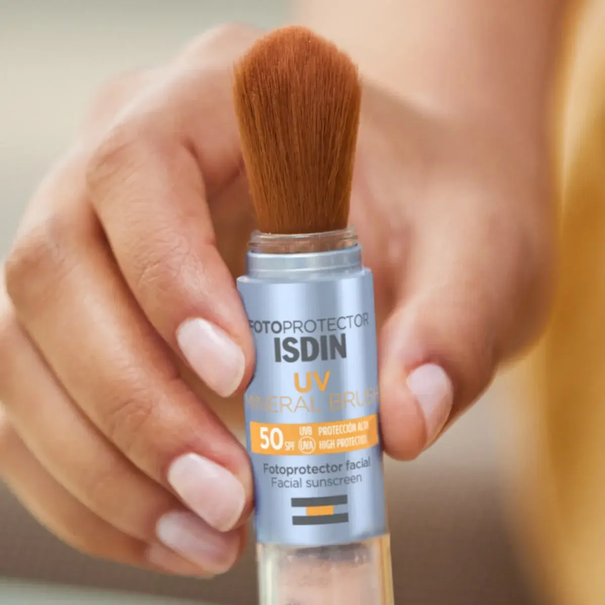Aplica UV Mineral Brush SPF 50 sobre la piel seca, media hora antes de la exposición solar. Reaplica cada 2 horas o tras transpirar, nadar o secarse con la toalla. Antes de aplicar, te recomendamos dar dos pequeños toques a la brocha sobre el dorso de la mano para retirar los restos de producto, evitando así que se derramen sobre el rostro durante la aplicación.