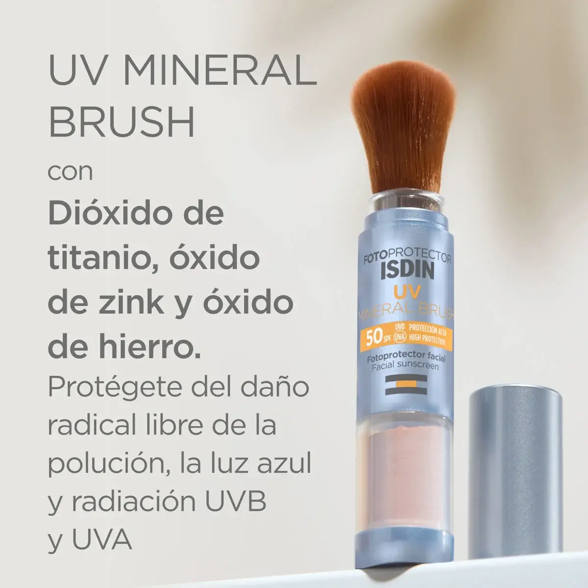 Protege tu piel contra la luz azul y la radiación UVB/UVA con el fotoprotector facial en brocha UV Mineral Brush SPF 50 Con Filtros 100% minerales y efecto antipolución, está indicado para su aplicación sobre el maquillaje.